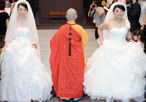 8月11日,台湾桃园,同为佛教徒的台湾女同性恋情侣美瑜和雅婷,依照传统佛教仪式举行婚礼。