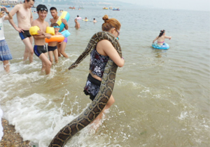 在大连开发区南坨子浴场,一名女子带着一条巨大的蟒蛇到海里冲凉,立刻引来了很多人围观。